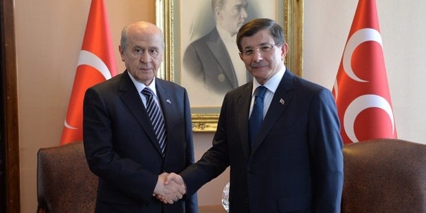 AKP Genel Başkanı ve Başbakan Ahmet Davutoğlu ile MHP Genel Başkanı Devlet Bahçeli'nin koalisyon kurma çalışmaları kapsamında Meclis'te bir araya geldiği görüşme sona erdi. Koalisyon görüşmesine Davutoğlu ile AKP'den katılan tek isim olan Çalışma ve Sosyal Güvenlik Bakanı Faruk Çelik, görüşmenin olumlu geçtiğini vurgulayarak "Sayın Başbakan'ımız çok güzel açıklamalar yapacak" dedi. Ancak Çelik'in sözlerini yalanlayan açıklama Davutoğlu'ndan geldi. AKP Genel Merkezi'nde düzenlediği basın toplantısında değerlendirmelerde bulunan Davutoğlu, Bahçeli'nin kendilerine "Olabilecek senaryoları bir araya getirerek, bir koalisyon mümkün görünmüyor" dediğini açıkladı. Davutoğlu, Devlet Bahçeli'nin "Azınlık hükümeti, kısa süreli seçim hükümeti ve erken seçime 'hayır' dediğini" duyurdu. Davutoğlu, "MYK ve Sayın Cumhurbaşkanı’yla istişare ettikten sonra gerekirse görevi iade edeceğim" ifadesini kullandı.